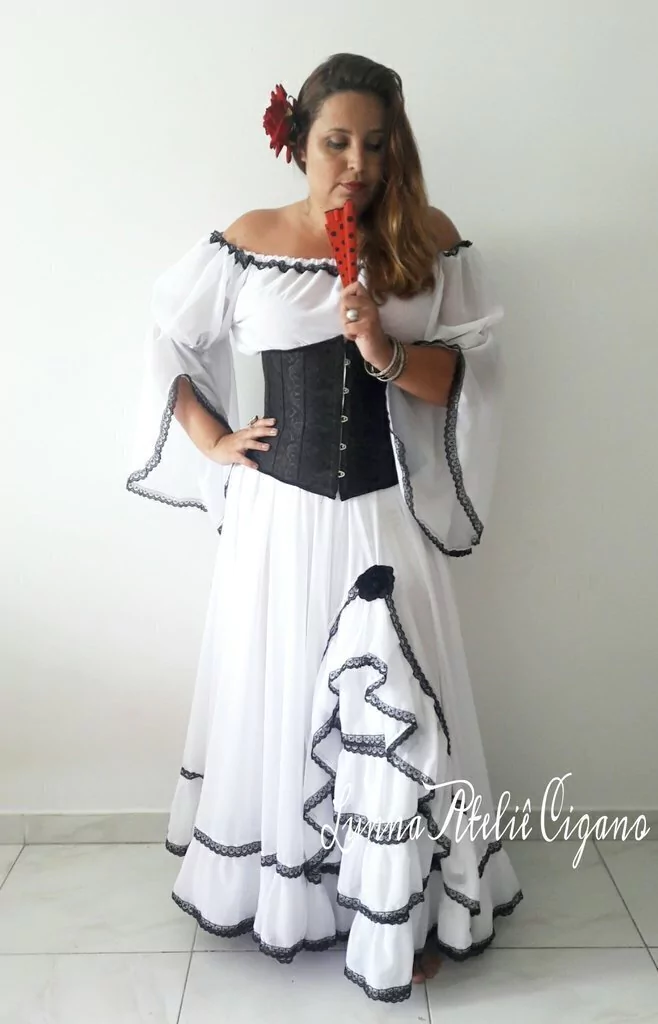 Blusa estilo bata, soltinha veste ate GG em crepe com detalhe em renda preta com forro frontal. Saia em crepe chifon com detalhe em renda preta com aproximadamente 12 metros de roda. Prazo de confeccao ate 30 dias. Ao fazer o pedido informar o comprimento/altura em centimetros da saia. Saia não acompanha forro Flor-broche não acompanha a saia. Cinturão underbust vendido separadamente.
