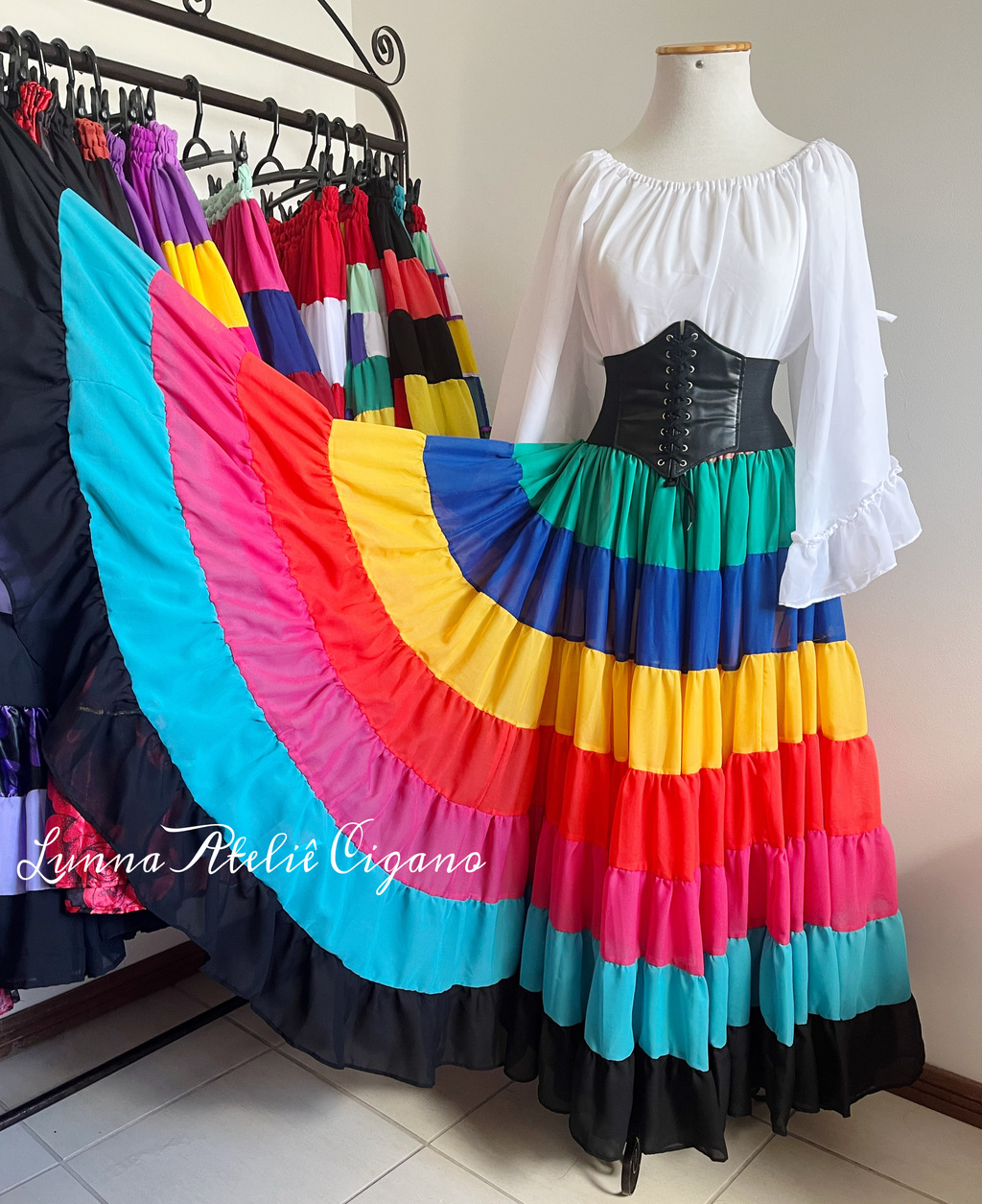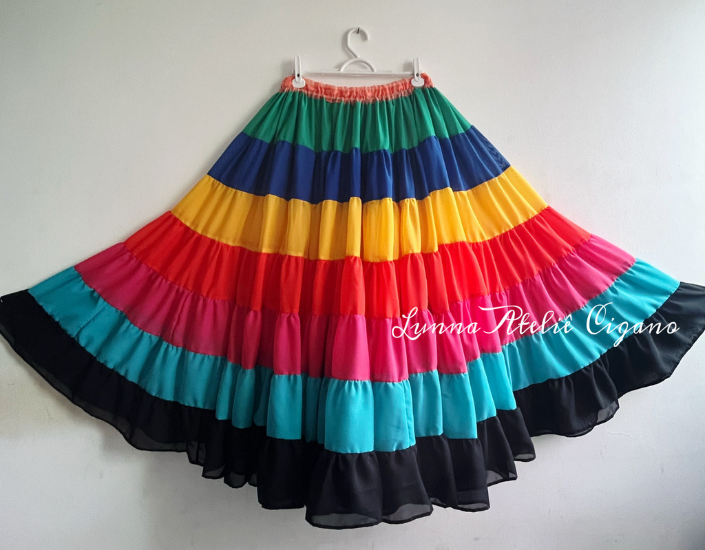 Saia confeccionada em crepe em cores variadas com 20 metros de roda.