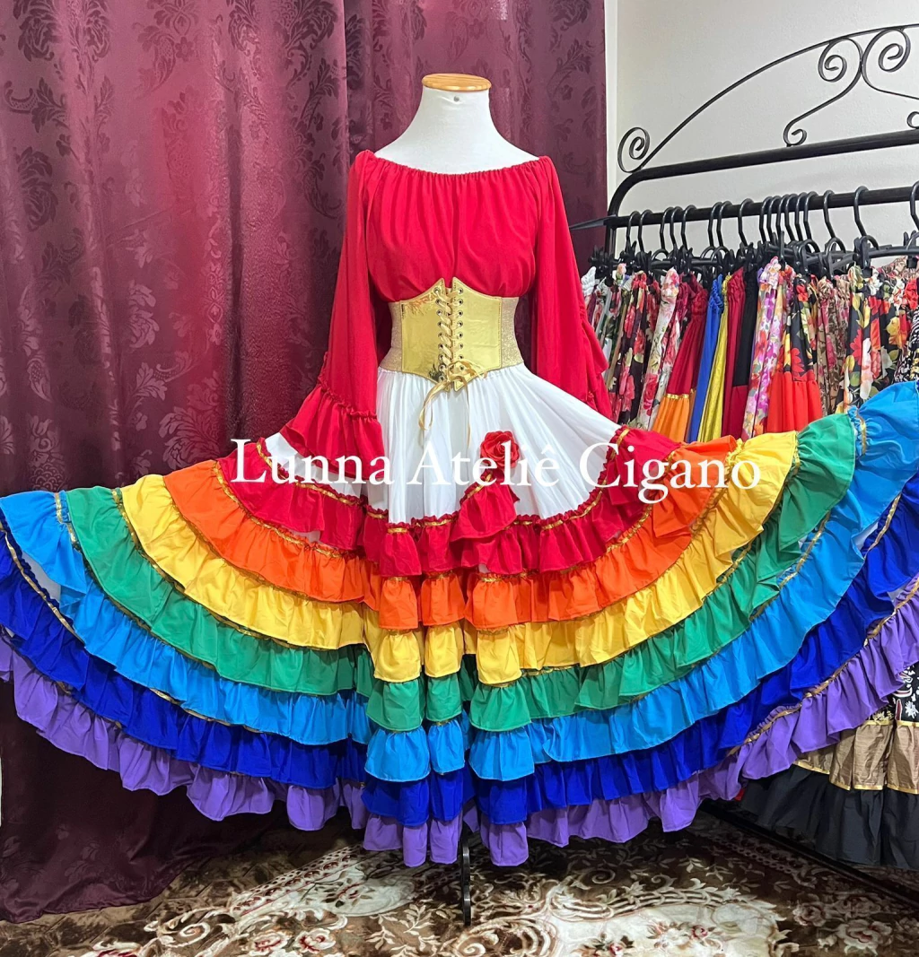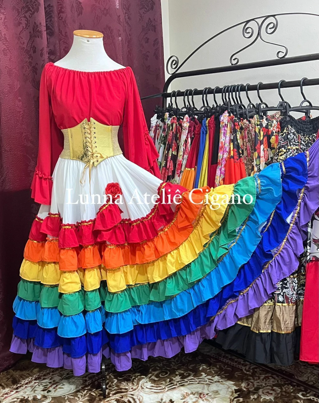 Saia confeccionada em crepe nas cores do arco iris com detalhe em fita de cetim dourado medinso 15 metros de roda.