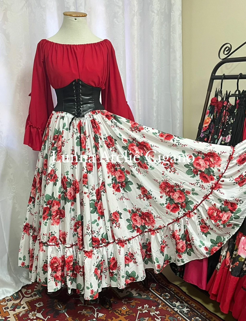 Saia confeccionada em crepe floral fundo branco com 20 metros e detalhe em fita vermelha.