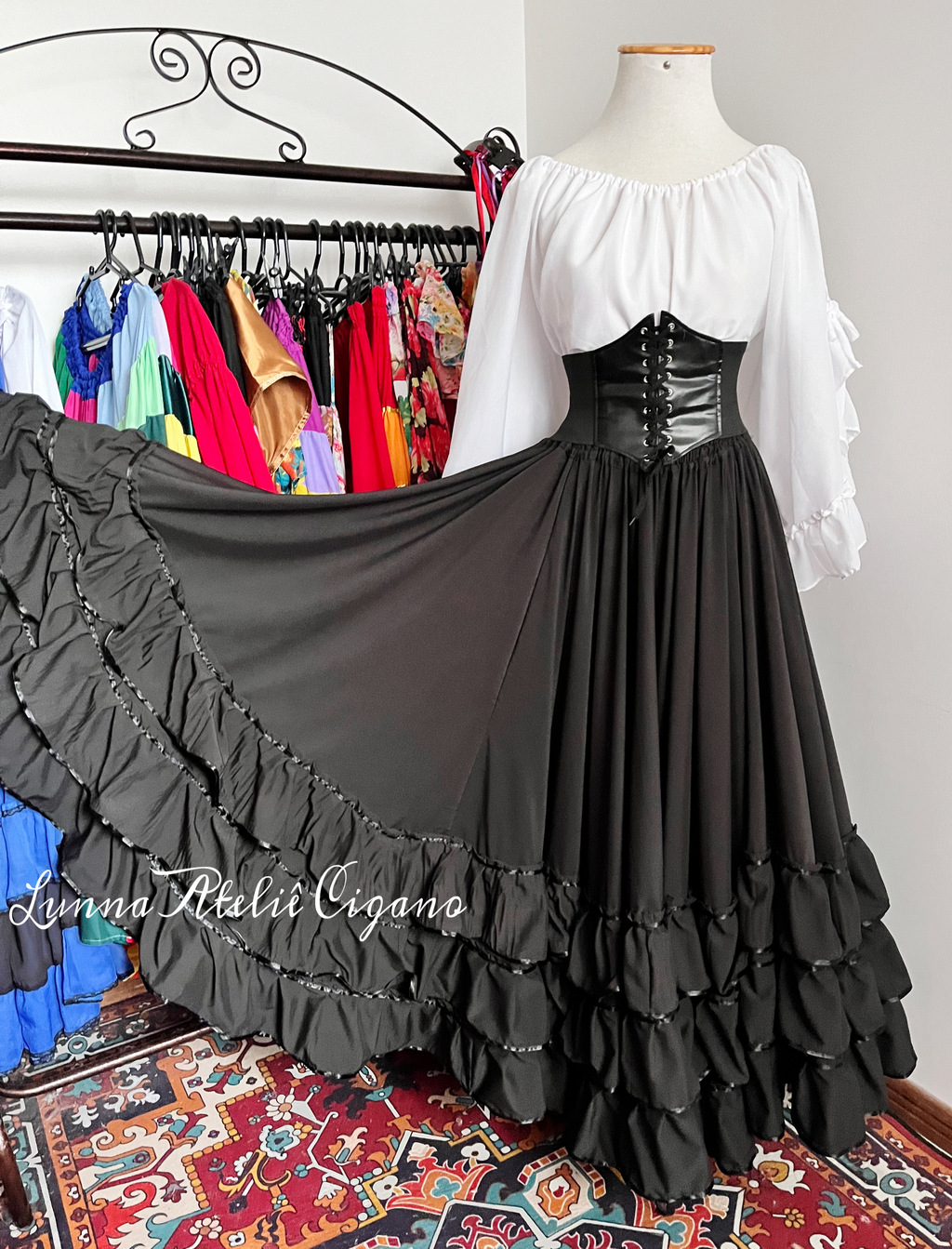 Saia confeccionada em crepe preto com detalhes em fita de cetim preta e 15 metros.