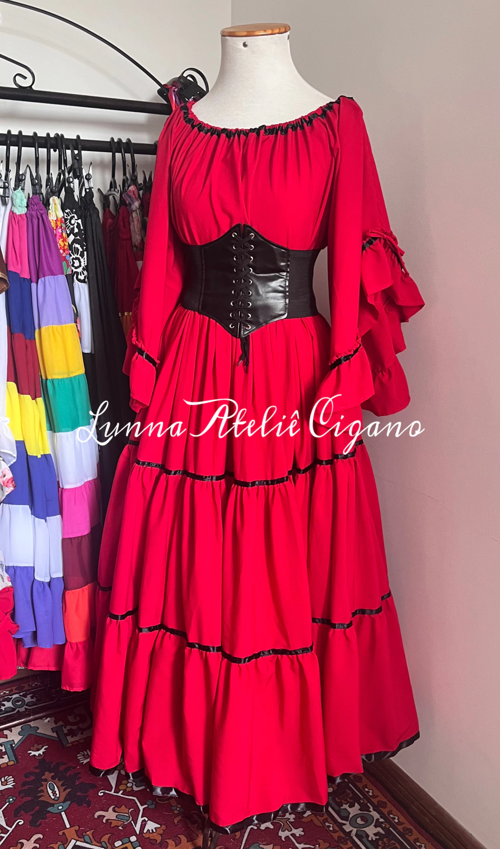 Saia confeccionada em crepe vermelho com detalhe em fita de cetim preta medindo 10 metros Prazo de confeccao ate 30 dias.